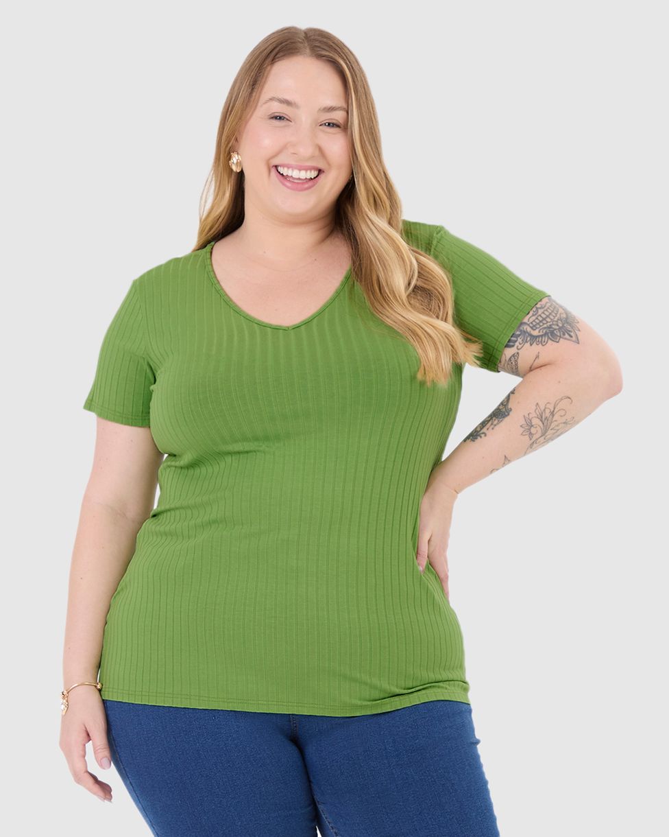 Plus SizeFemininoBlusas e CamisetasBlusa Básica Feminina Plus Size Decote V Em Canelado De Viscose