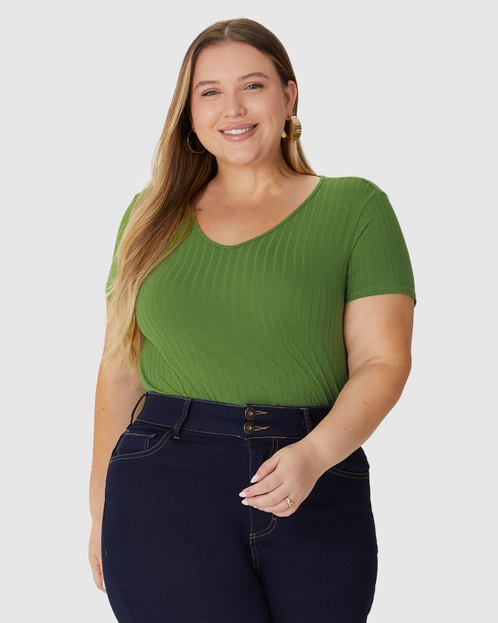 Blusa Básica Feminina Plus Size Decote V Em Canelado De Viscose