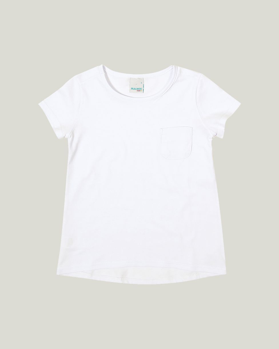 Blusa confeccionada em meia malha. Modelagem mullet, com parte posterior maior. Modelo com decote redondo e mangas curtas. Detalhe de bolso funcional. Uma peça básica e ideal para aproveitar os dias quentes com a família. Combine com calça clochard e tênis de caninho colorido.
