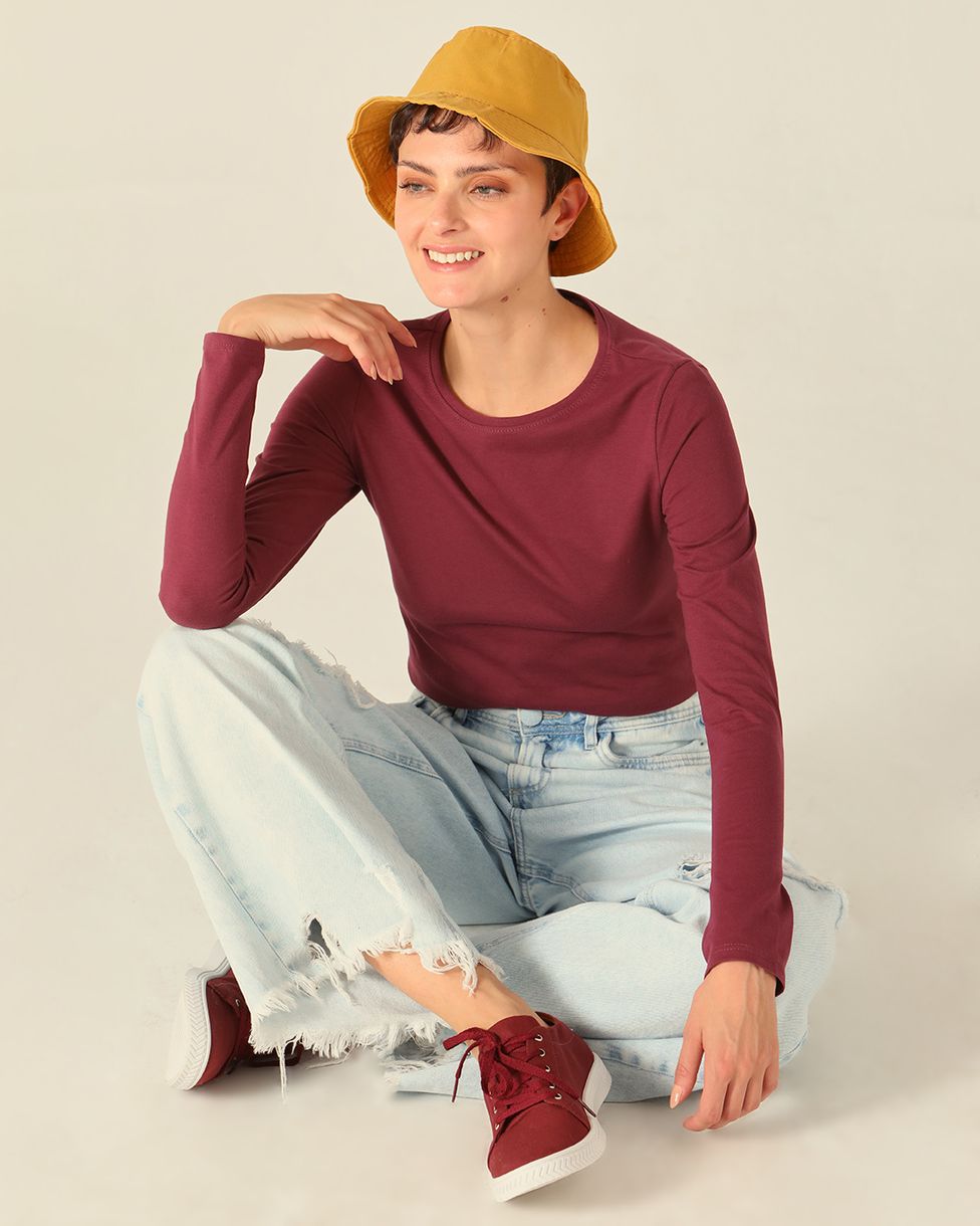 Blusa Básica Feminina Decote Redondo Manga Longa Em Algodão