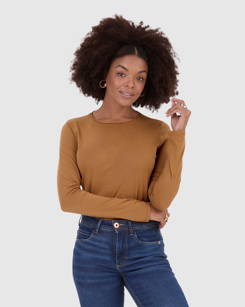 Blusa Básica Feminina Decote Redondo Manga Longa Em Algodão