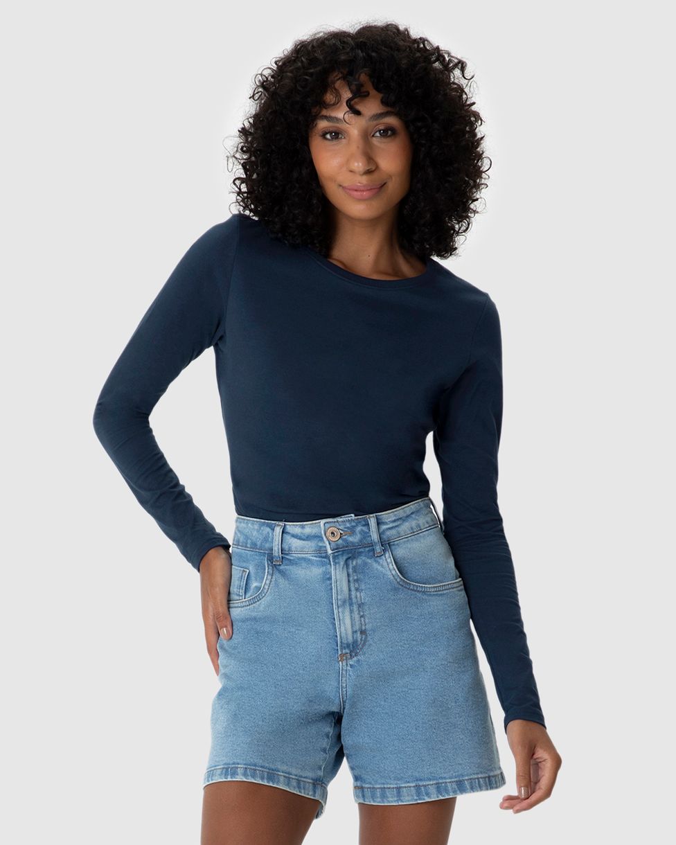 Blusa Básica Feminina Decote Redondo Manga Longa Em Algodão