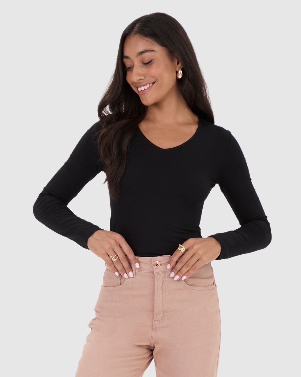 Blusa Básica Feminina Gola V Manga Longa Em Viscose Stretch