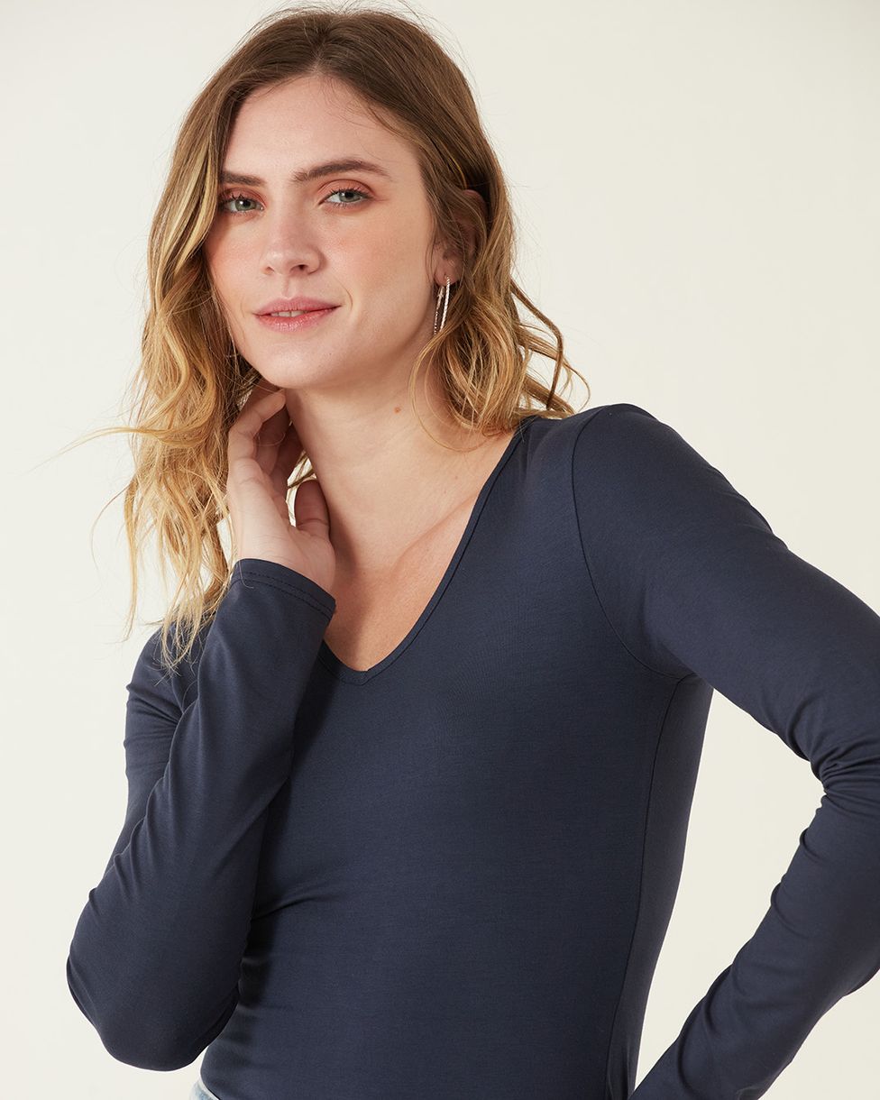 Blusa Básica Feminina Gola V Manga Longa Em Viscose Stretch