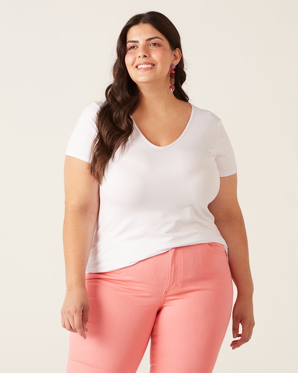 Blusa Básica Feminina Plus Size Decote V Em Viscose Stretch
