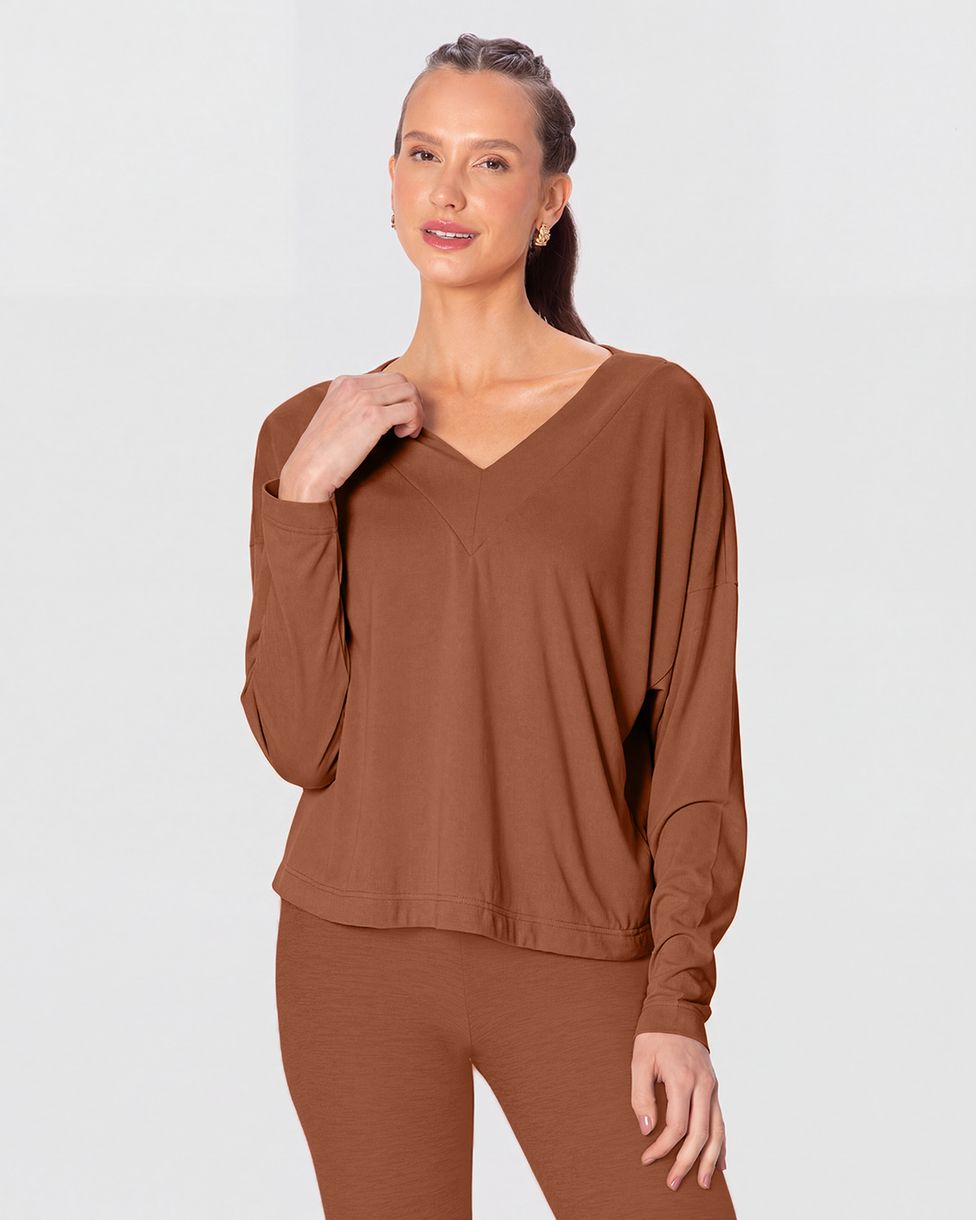 Blusa Esportiva Feminina Box Decote V Manga Longa Malha Dry E Proteção UV Malwee Active Marrom - P