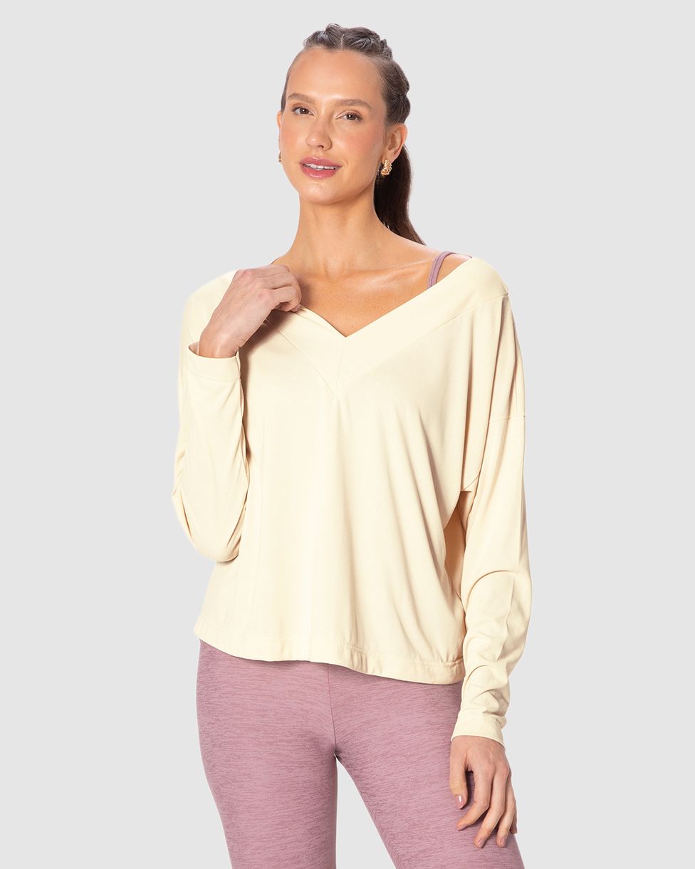 Blusa Esportiva Feminina Box Decote V Manga Longa Malha Dry E Proteção UV Malwee Active Off White - P