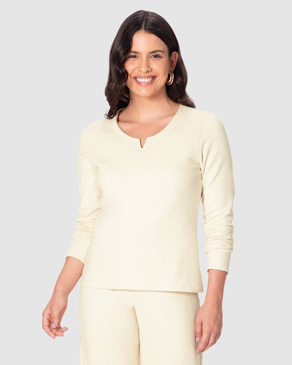 Blusa Feminina Decote Duplo V Manga Longa Em Moletom Linho Off White - PP
