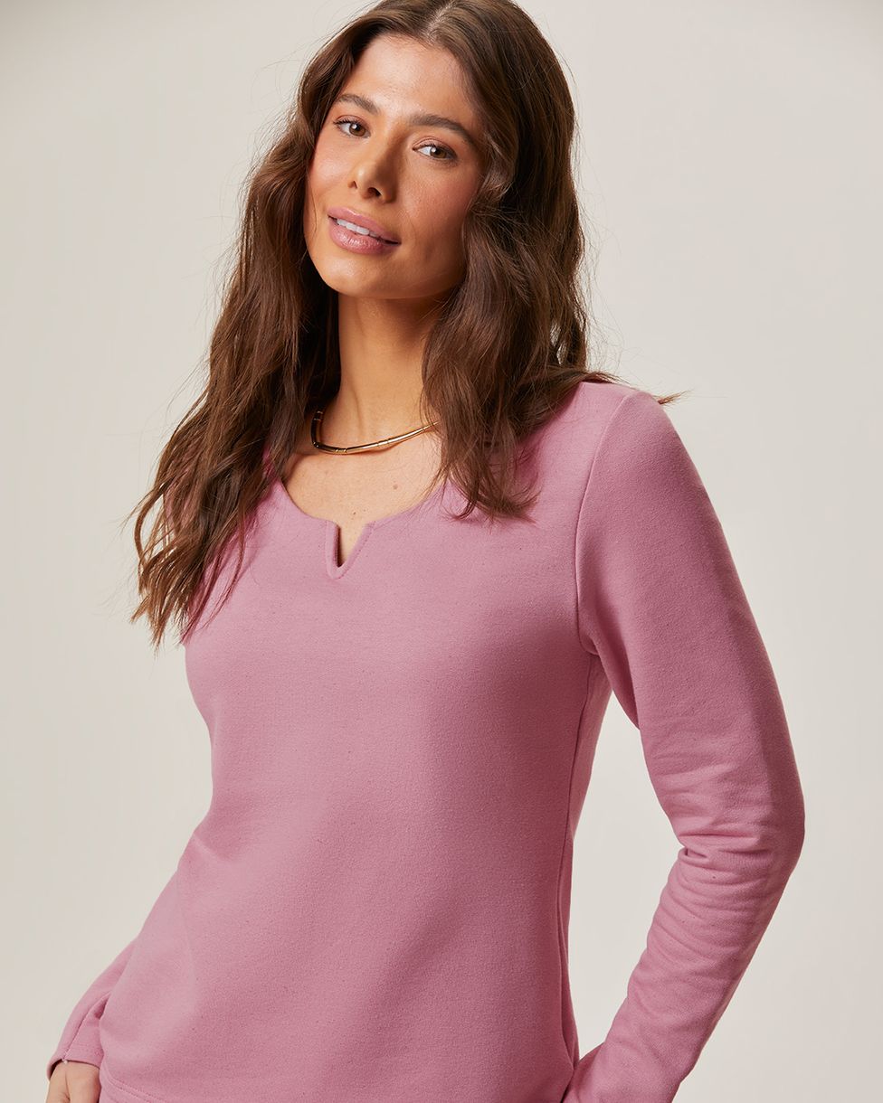 Blusa Feminina Decote Duplo V Manga Longa Em Moletom Linho Rosa - G
