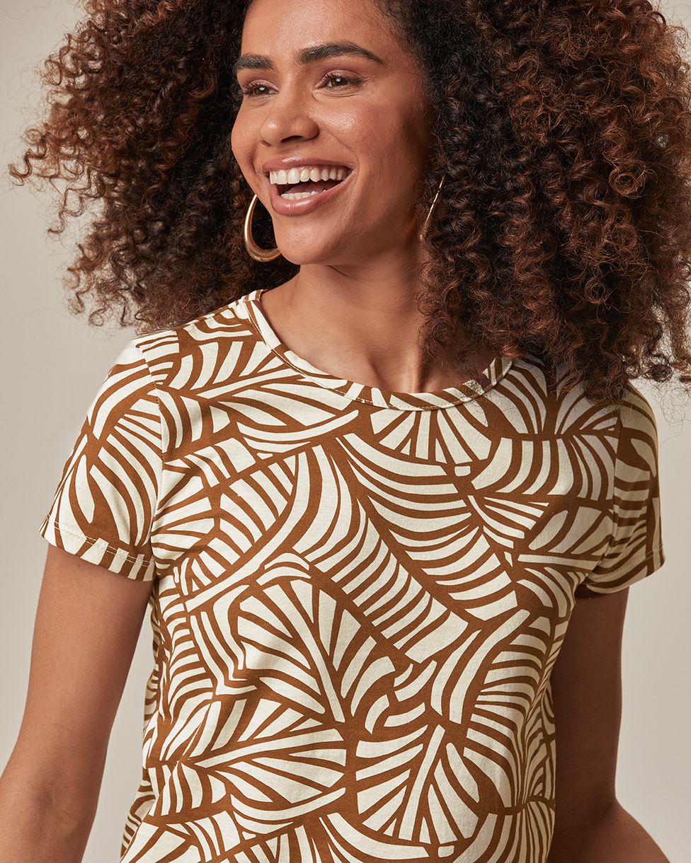 Blusa Feminina Decote Redondo Estampada Em Algodão Marrom - XGG