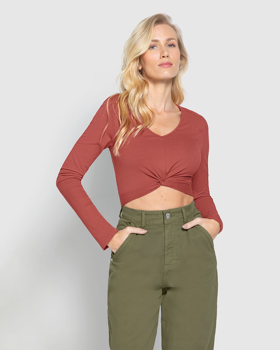 • A Blusa Cropped feita em malha canelada de viscose apresenta decote em V, mangas longas e detalhe torção frontal. Aposte em looks casuais!