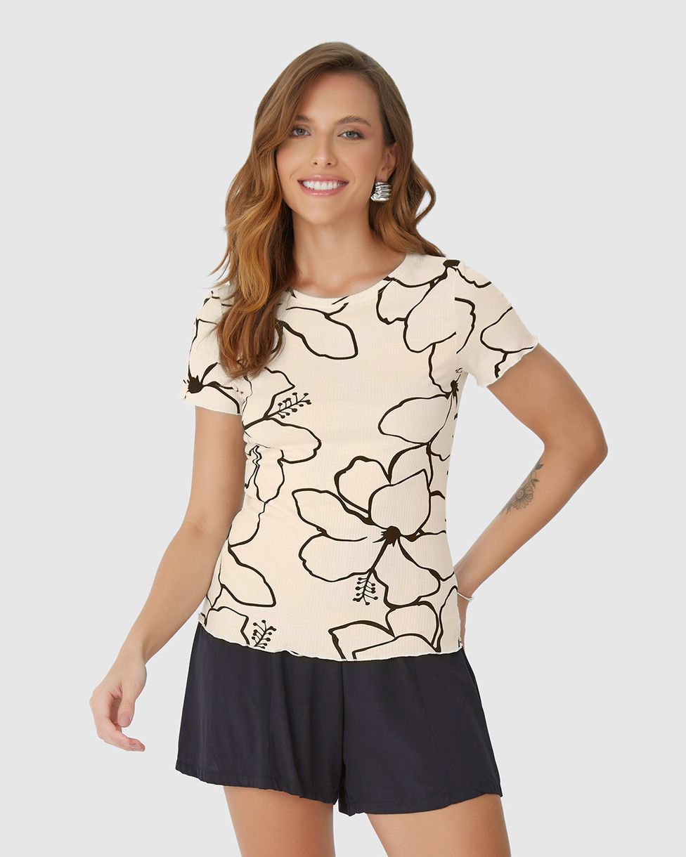Blusa Feminina Estampada Com Picot Em Canelado De Viscose
