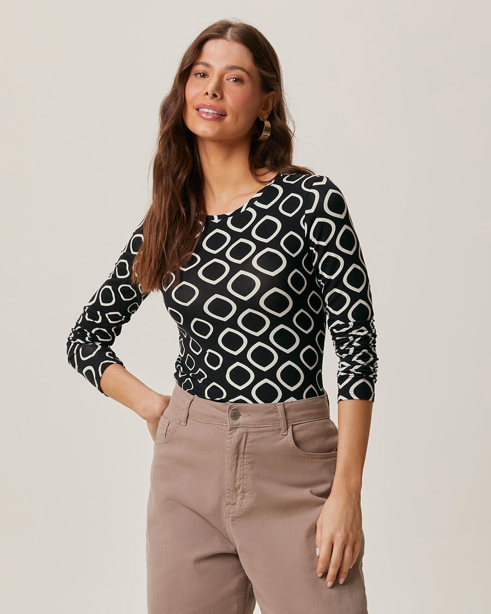 Blusa Feminina Estampada Decote Redondo Manga Longa Em Viscose Stretch Preto - PP