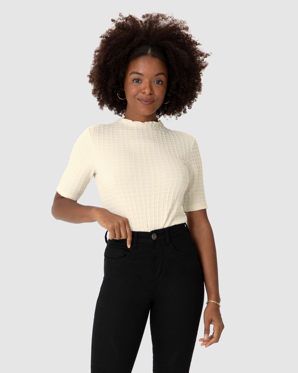 Blusa Feminina Gola Alta Manga Curta Em Jacquard Texturizado