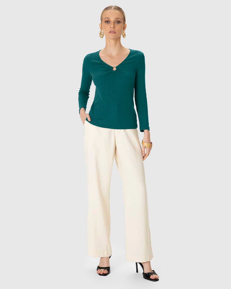 Blusa Feminina Gola V Detalhe Argola E Manga 7/8 Em Tricô Jacquard - ENFIM