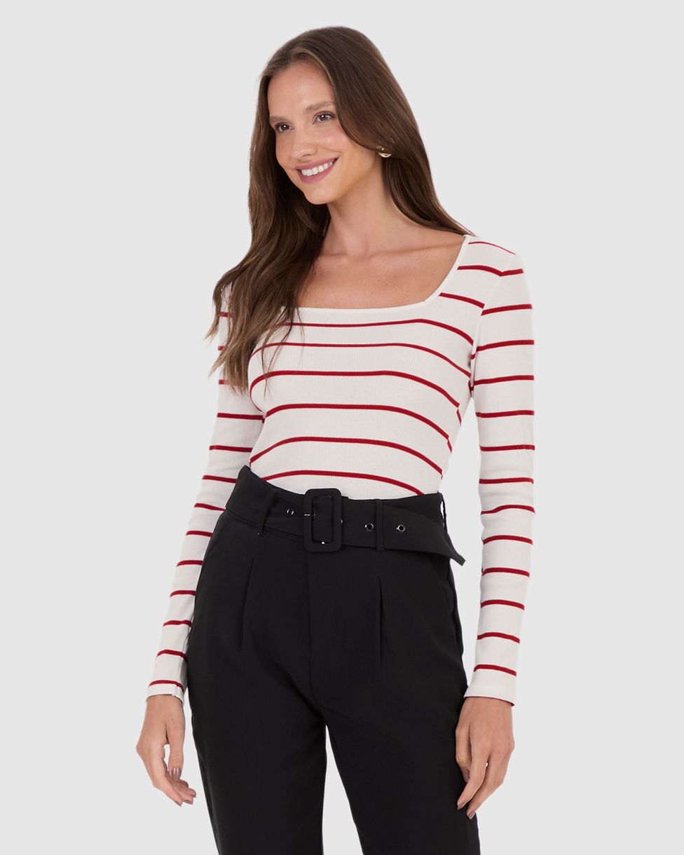 FemininoBlusas e CamisetasBlusas Manga LongaBlusa Feminina Justa Decote Quadrado Em Ribana Listrada