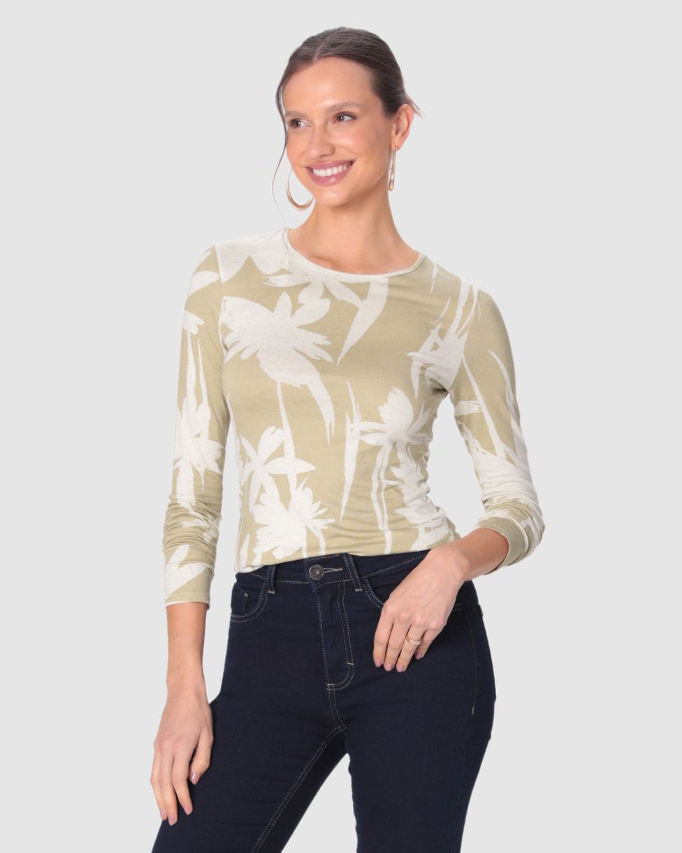 FemininoBlusas e CamisetasBlusas Manga LongaBlusa Feminina Justa Manga Longa Estampada Em Malha Viscolinho Stretch