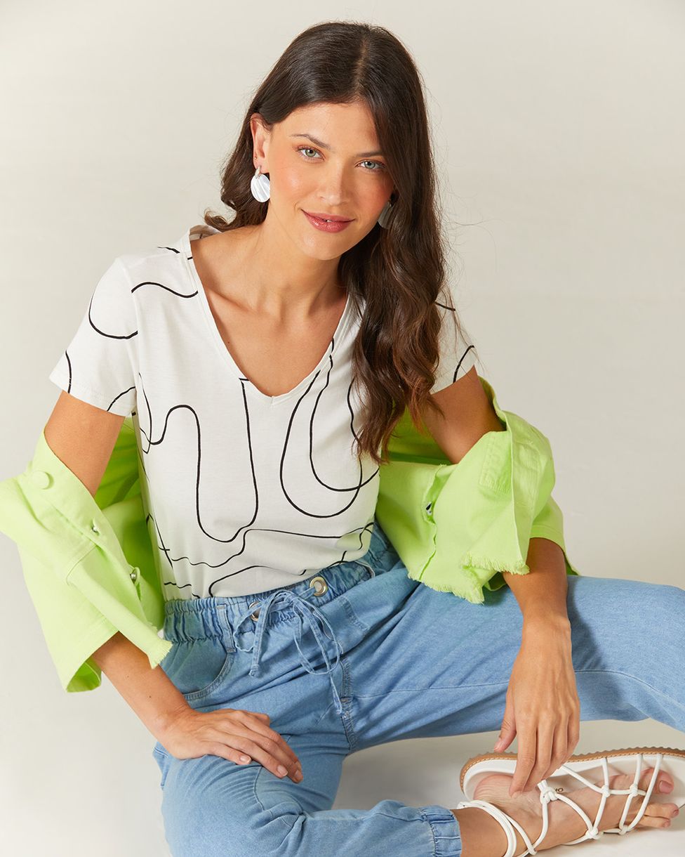 Blusa feminina feita em meia malha 100% algodão. Esse modelo apresentando estampa de linhas abstratas, conta com decote V e mangas curtas. Além do seu caimento que é super confortável no corpo. Além disso, ela foi feita em meia malha de algodão 100%, super confortável, respirável com toque macio e fácil manuseio, garantindo alta durabilidade e versatilidade no uso. Uma peça ideal para os dias casuais, invista com short jeans de cintura alta Malwee e tênis flatform!