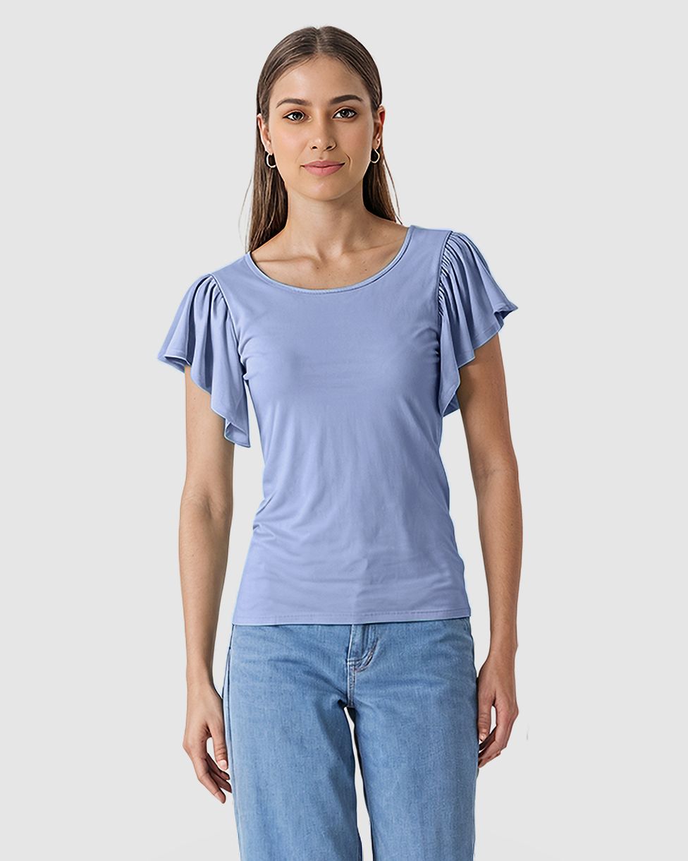 FemininoBlusas e CamisetasBlusas Manga CurtaBlusa Feminina Manga Babado Frente E Decote U Costas Em Malha Viscose