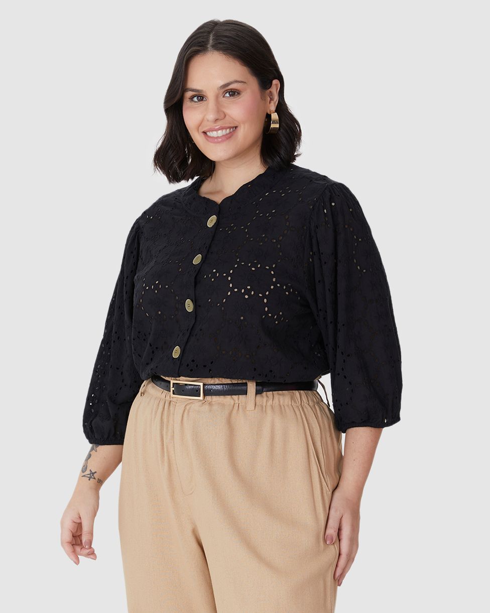 A Blusa Feminina Plus Size Abotoamento Frontal Manga 3/4 em Laise Algodão combina charme e conforto em um design delicado. Com tecido leve e detalhes bordados, traz elegância e frescor, perfeito para compor looks sofisticados e versáteis.