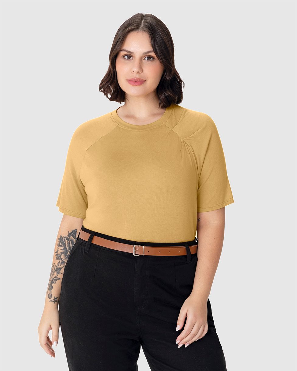Blusa Feminina Plus Size Ampla Detalhe Costura Ombro Em Viscose Stretch Amarelo - G5