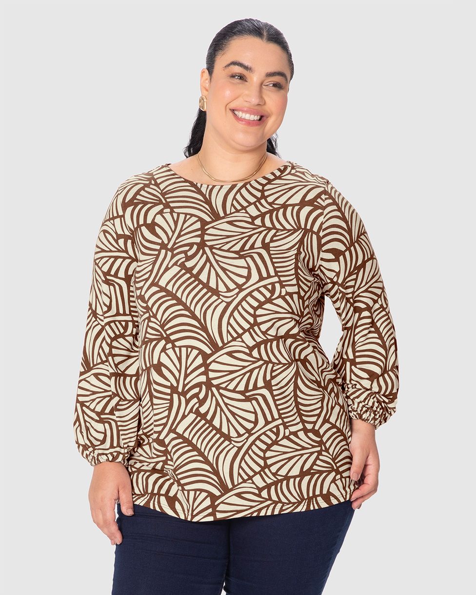 Blusa Feminina Plus Size Ampla Manga Longa Em Malha Viscolinho Stretch Marrom - G5