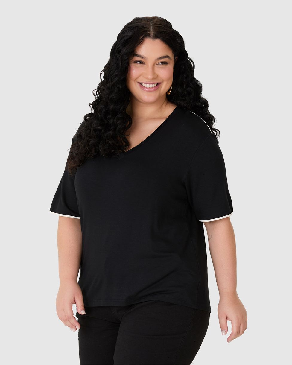 • Decote V que valoriza o colo e manga curta para maior conforto