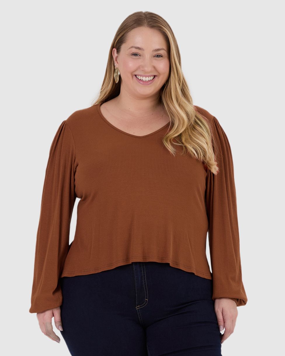 Blusa Feminina Plus Size Decote V Manga Longa Em Malha Viscose Canelada
