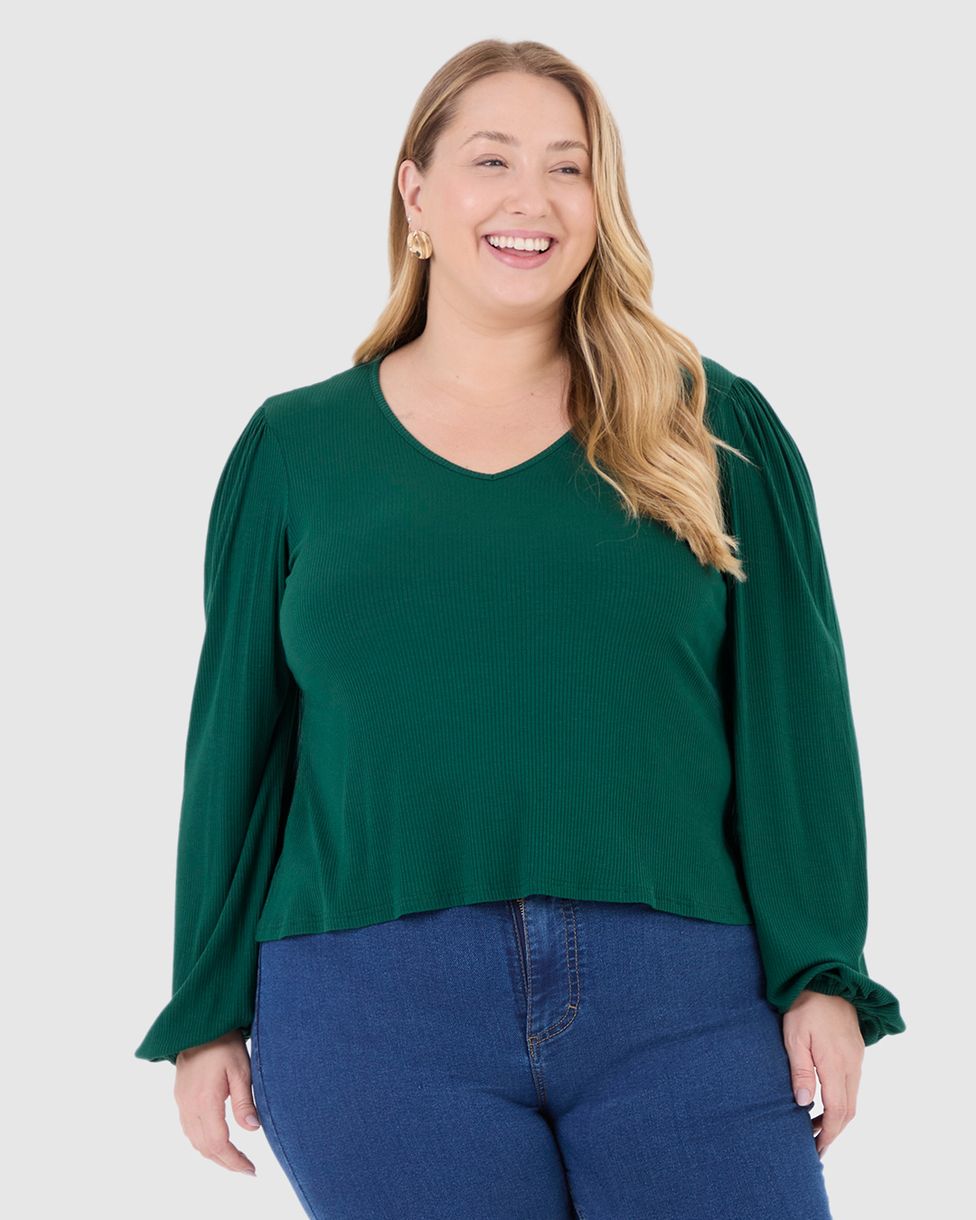 Blusa Feminina Plus Size Decote V Manga Longa Em Malha Viscose Canelada