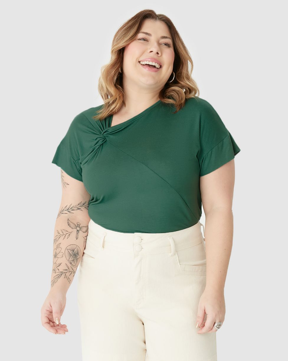 Blusa Feminina Plus Size Detalhe Torção Frontal Em Malha Viscolinho Stretch Verde - G2