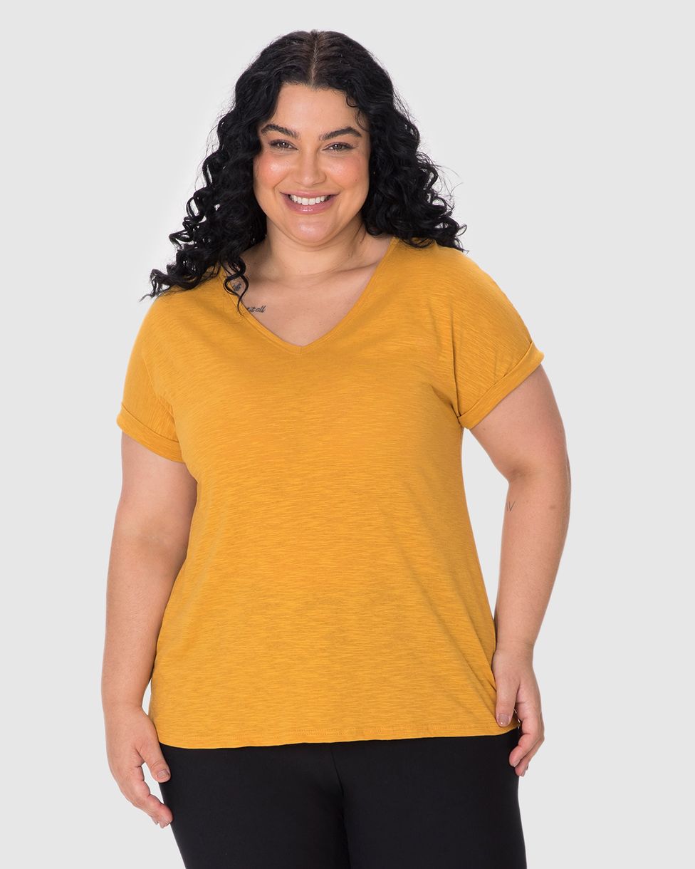 Plus SizeFemininoBlusas e CamisetasBlusa Feminina Plus Size Mullet Decote V Manga Curta Em Malha Rajada