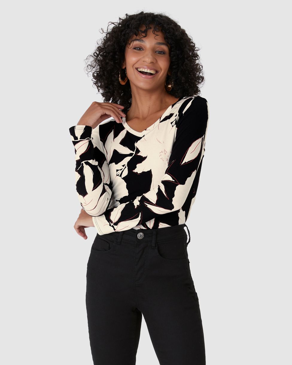 Blusa Justa Feminina Decote V Estampada Em Viscose Stretch