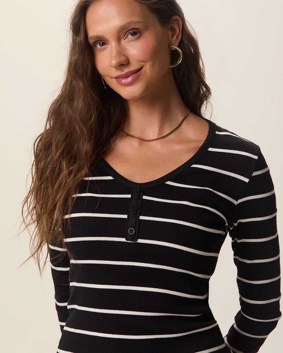 Blusa Justa Feminina Listrada Decote V Peitilho Com Botões Em Ribana