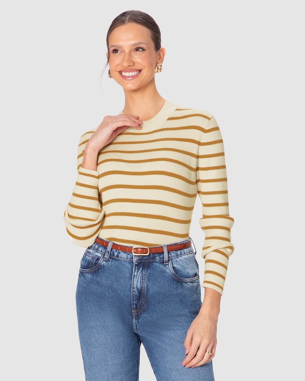 Blusa Justa Feminina Listrada Manga Longa Em Tricô