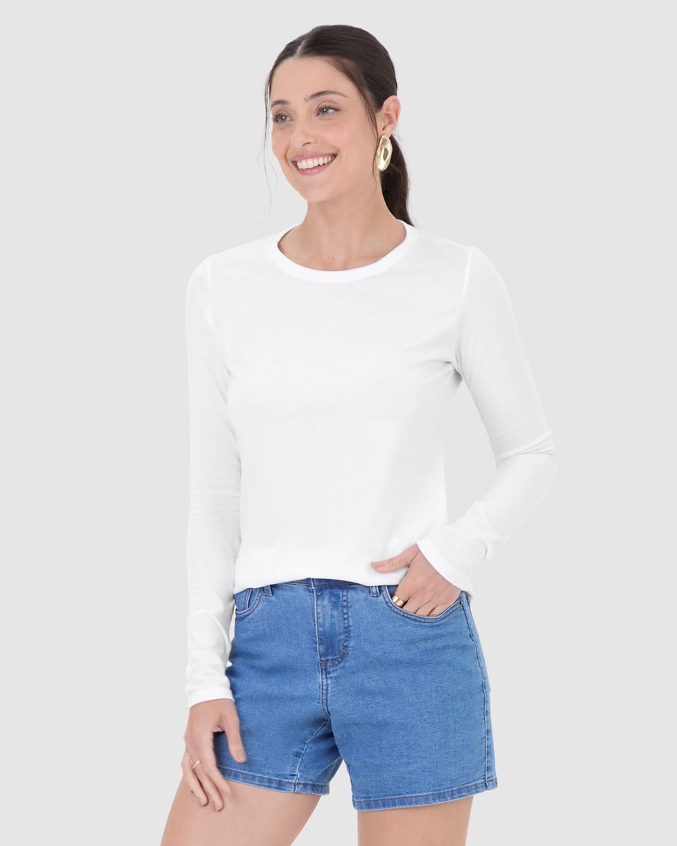 Blusa Básica Feminina Decote Redondo Manga Longa Em Algodão