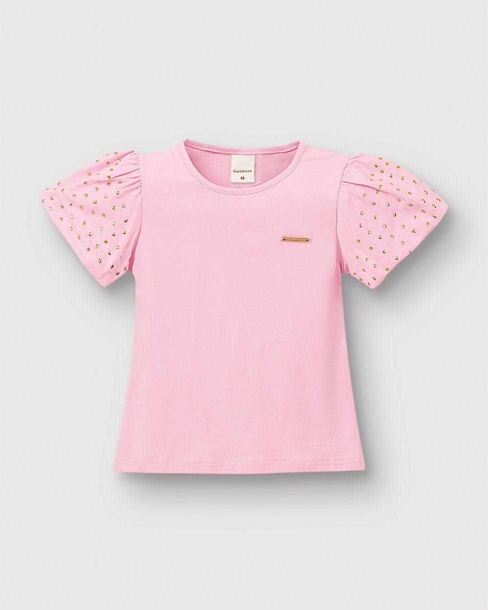 Blusa Menina Manga Curta Aplique Lantejoulas Em Algodão - Carinhoso
