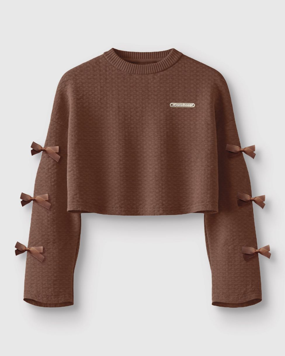 A Blusa Cropped da Carinhoso é o destaque doce do Outono Inverno 26. Em malha texturizada, a peça une modernidade e delicadeza com seus laços aplicados nas mangas. Perfeita para meninas que amam um visual fashionista, garantindo conforto e estilo em qualquer ocasião
