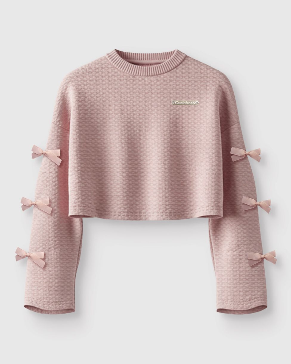 A Blusa Cropped da Carinhoso é o destaque doce do Outono Inverno 26. Em malha texturizada, a peça une modernidade e delicadeza com seus laços aplicados nas mangas. Perfeita para meninas que amam um visual fashionista, garantindo conforto e estilo em qualquer ocasião