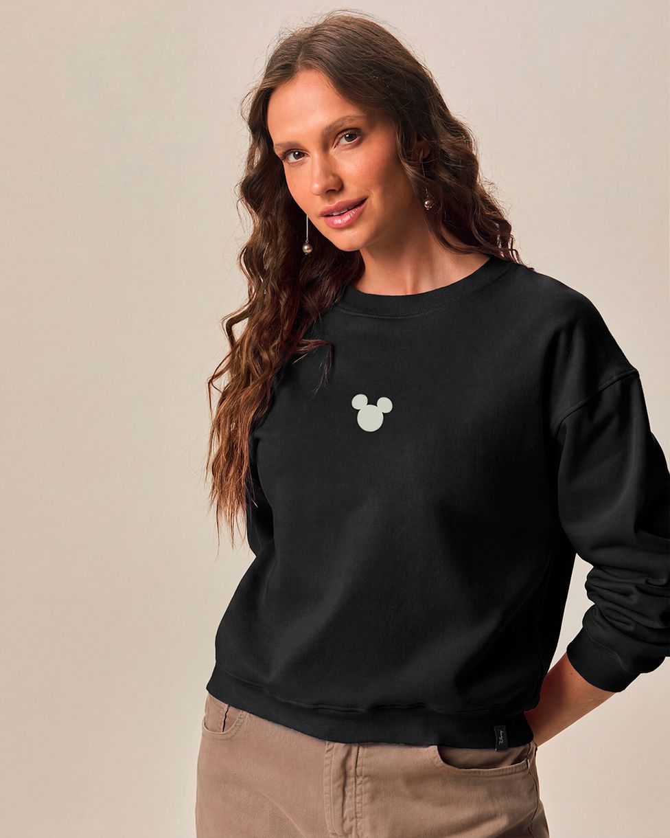 Blusão Amplo Feminino Estampa Frontal Mickey Mouse Em Moletom Flanelado Preto - P