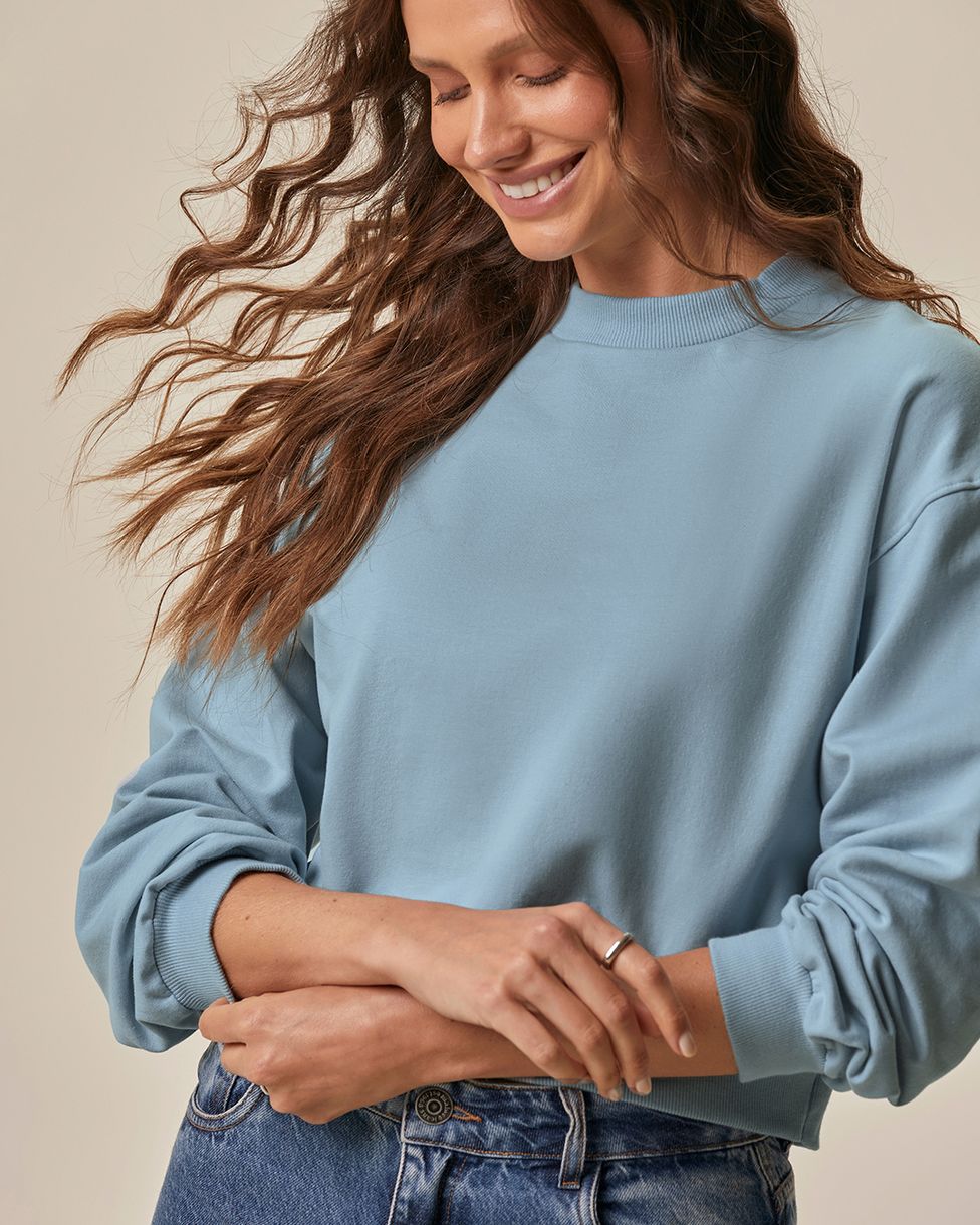 Blusão Básico Feminino Cropped Em Moletom Stretch Flanelado Azul - XGG