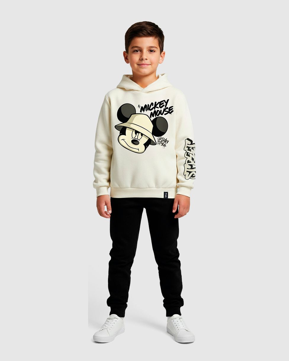 O Blusão Infantil Menino Mickey Mouse traz o estilo das ruas para o guarda-roupa dos garotod. Feito em moletom flanelado, ele possui capuz e estampas radicais do Mickey, incluindo detalhes em puff e artes nas mangas. É a peça perfeita para um inverno cheio de atitude e muito conforto.
