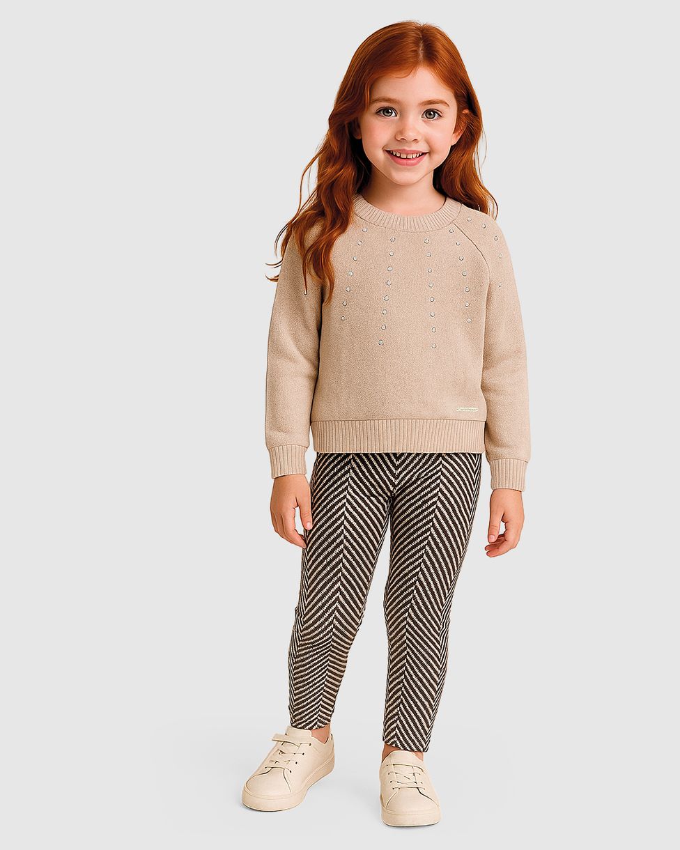 O Blusão Carinhoso em tricô combina o aconchego clássico com um toque de brilho moderno para as pequenas. Perfeito para o Outono Inverno, ele apresenta um design delicado com aplique de taxas que trazem um charme especial à peça, unindo conforto e estilo em um só look.