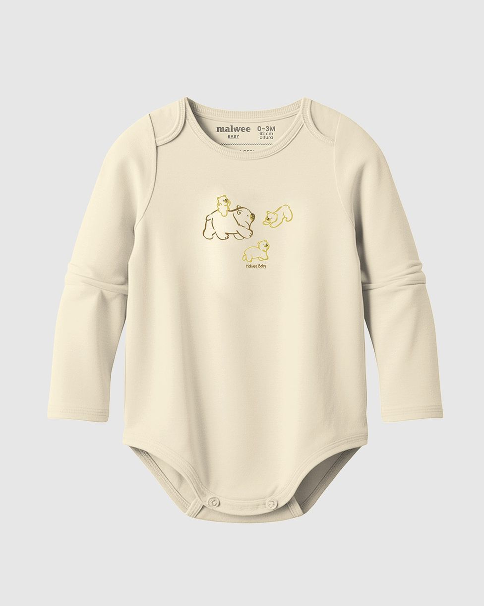 A Malwee Kids apresenta o Body Manga Longa, essencial para o enxoval de Outono Inverno. Feito em cotton light, com base em algodão, ele oferece o toque suave e a elasticidade que os bebês precisam. A estampa unissex de família ursinhos traz uma mensagem de união e amor.br> • Design transpassado com gola redonda e manga longa