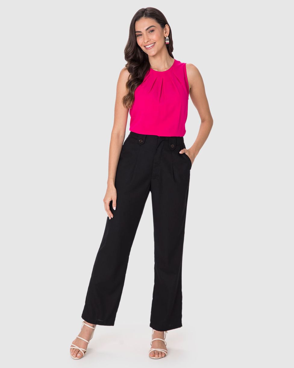 Calça Alfaiataria Feminina Cintura Alta Detalhe Botão Frontal Em Viscolinho