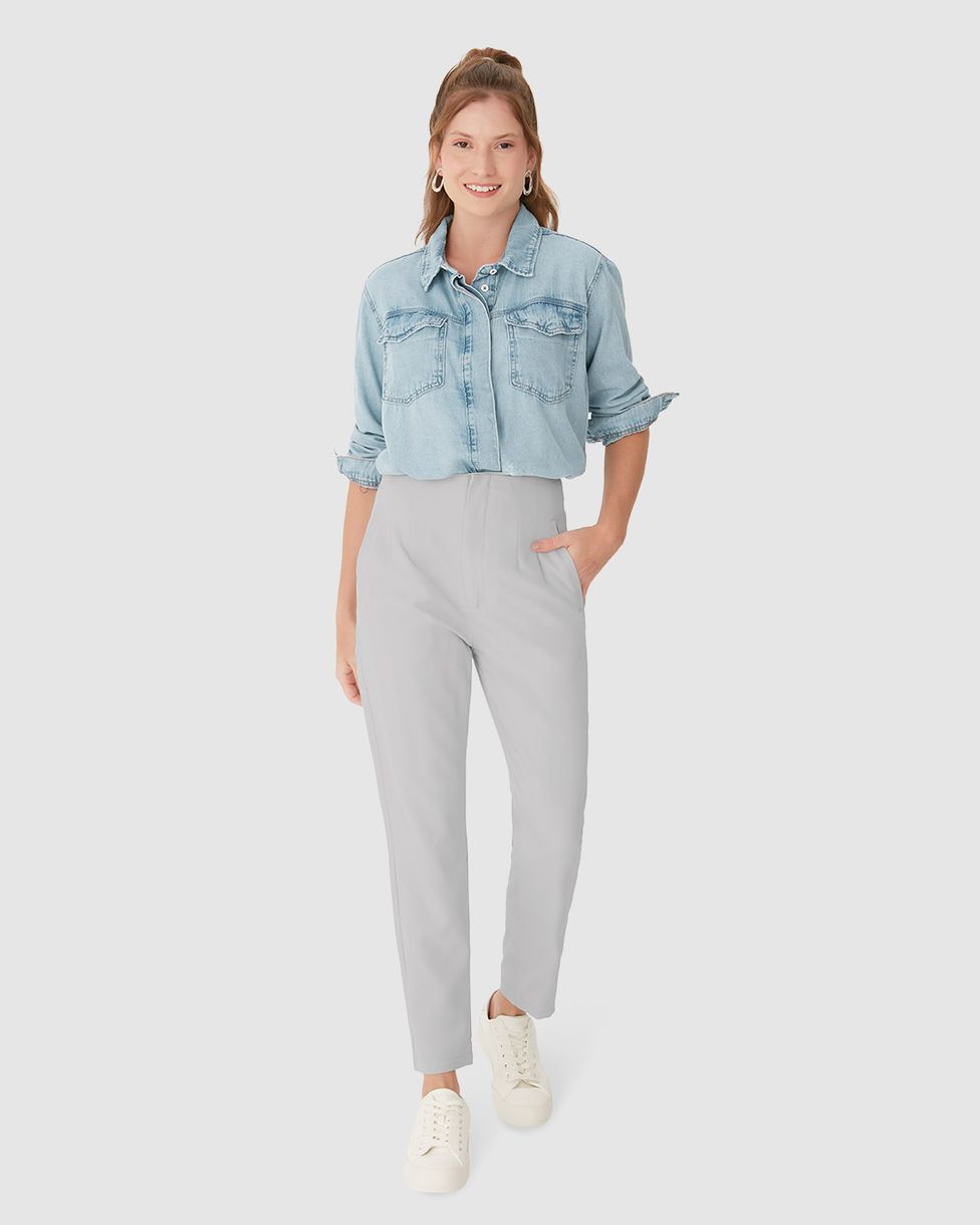 Calça Feminina Carrot Cintura Alta Bolso Funcional Em Poliéster