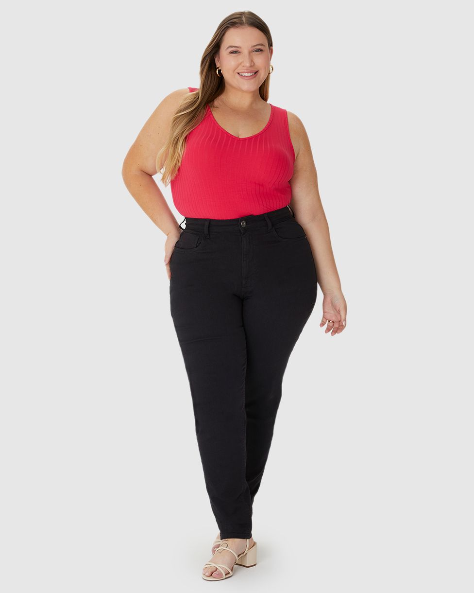 Calça Feminina Plus Size Mom Cintura Alta Ajustável Em Sarja Stretch