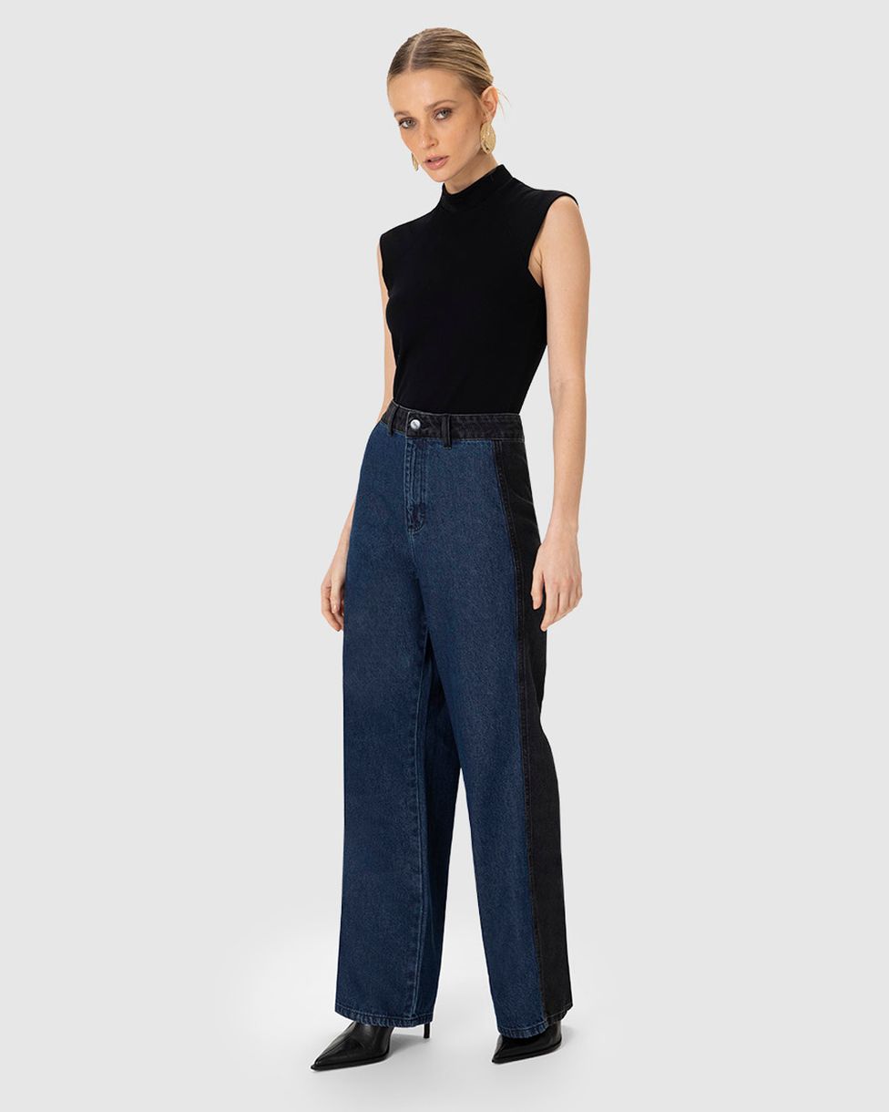 Calça Feminina Relaxed Fit Recorte Contraste Em Jeans 100% Algodão - ENFIM