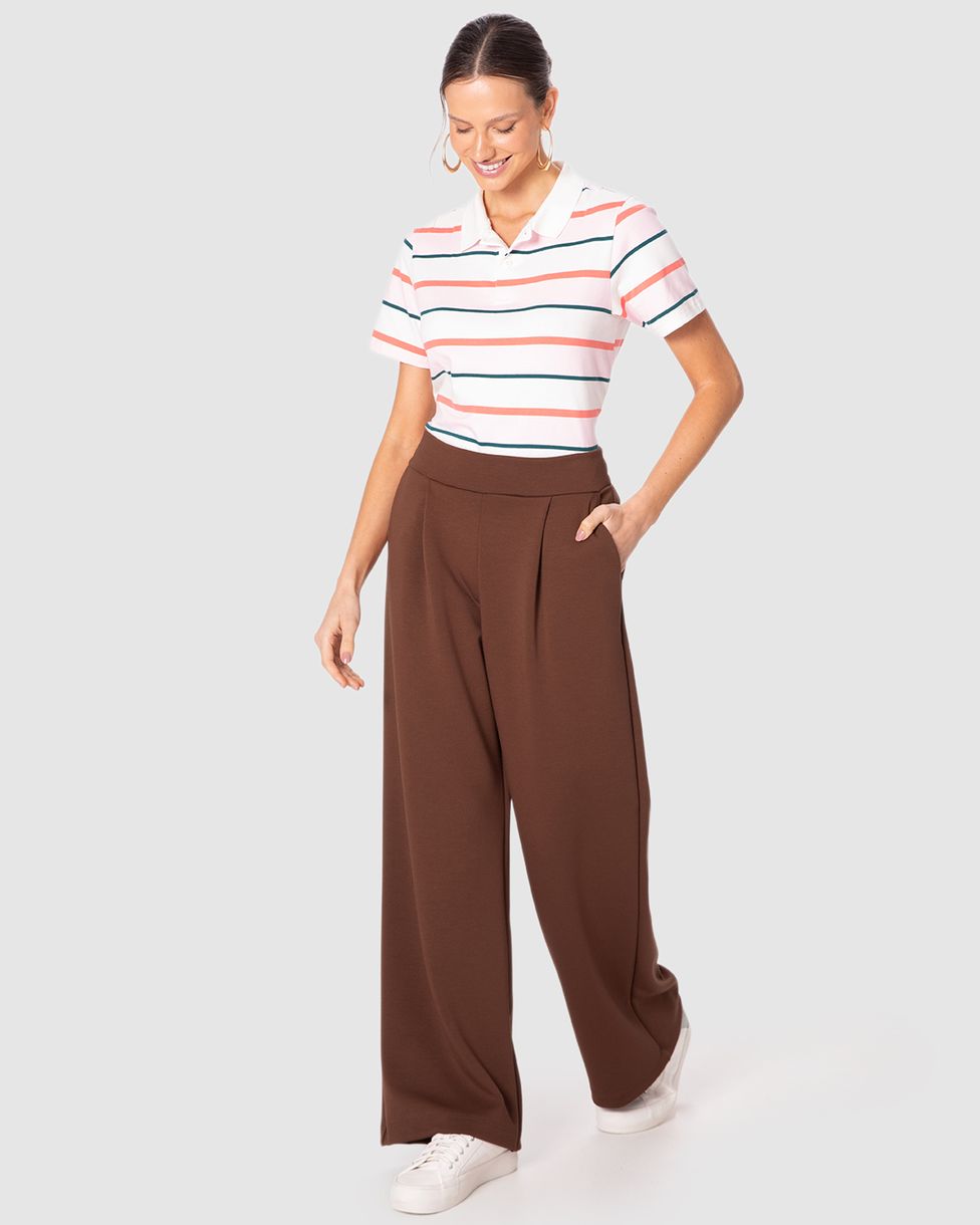 Calça Feminina Reta Cós Elástico Bolso Faca Em Malha Suedine Premium Marrom - P