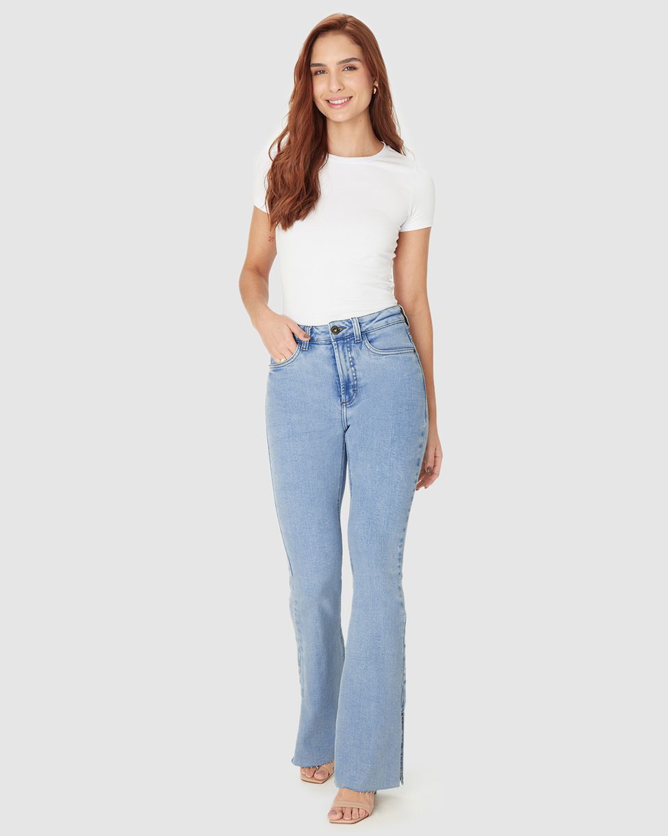 Calça Feminina Small Flare Fenda Lateral Barra Desfiada Em Jeans Stretch
