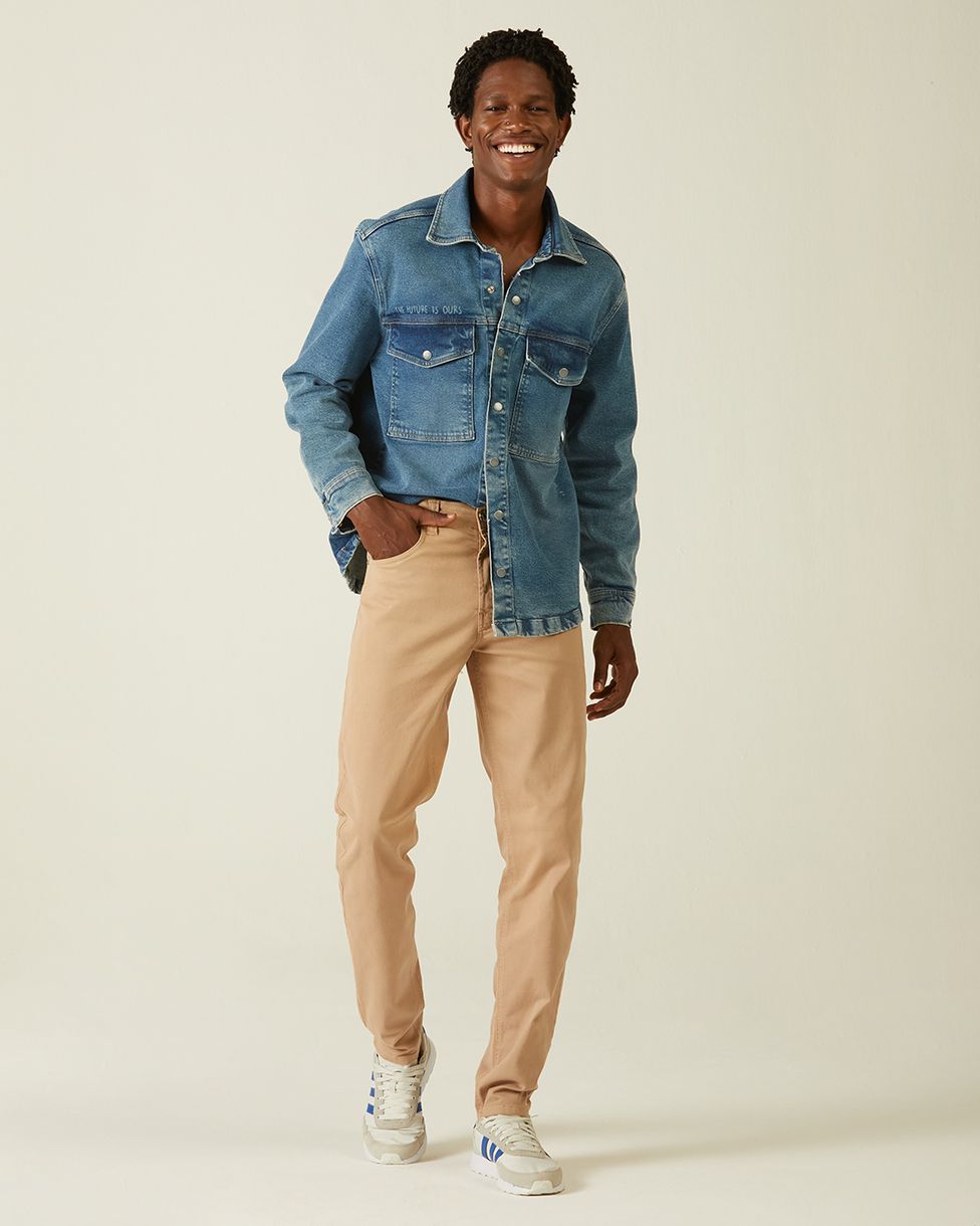 Calça masculina confeccionada em jeans com elastano, com as fibras de algodão e sarja. Apresentando a modelagem Slim, com caimento que se ajusta ao corpo, proporcionando conforto e versatilidade no vestir. Essa peça conta com cós com passantes, bolsos dianteiros e fechamento por zíper e botão único. Com bolsos posteriores e etiqueta decorativa da marca. O algodão é um clássico no guarda-roupa que apresenta aspecto natural, a sarja é um tecido plano mais encorpado que absorve o calor externo, proporcionando frescor ao vestir e o elastano traz maior conforto para a peça. Para um visual diferente e moderno, use com jaqueta jeans fechada Malwee e tênis sport!